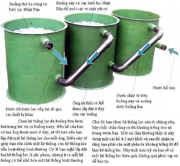 Nói một cách đơn giản, dễ hiểu thì nguồn nước từ hồ nuôi sẽ thông qua 2 đường là hút mặt và hút đáy, sẽ được đi qua lần lượt từ thùng 1 qua thùng 2, đến thùng 3 là ngăn bơm nước trả về hồ, và tạo thàng một vòng tuần hoàn liên tục. Ở mỗi thùng đều có các vật liệu lọc phù hợp để giúp loại bỏ những cặn bẩn, ô nhiễm, chất độc, giúp nguồn nước cung cấp cho hồ koi đảm bảo sạch, an toàn, koi sinh trưởng và phát triển tốt.