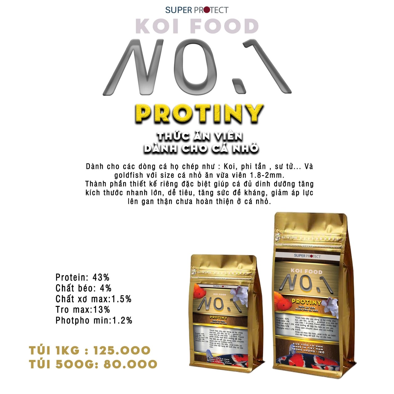 Sau hơn 3 năm đề ra kế hoạch và nghiên cứu theo đơn đặt hàng của anh Nguyễn Trí Dũng Arikoi , Super Protect đã cho ra đời dòng thức ăn cá cảnh No.1 Protiny size viên Max 2mm.