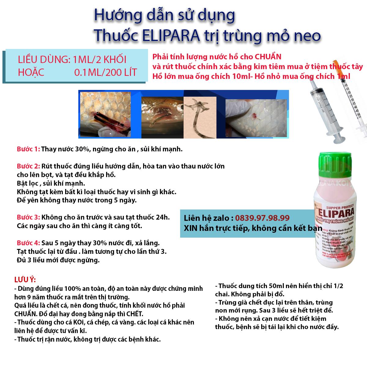 - Lưu ý: Không đánh thuốc Elipara trị trùng mỏ neo cá cảnh kết hợp với bất kì loại chất nào khác. Không cho ăn trước và sau khi đánh thuốc 24h.